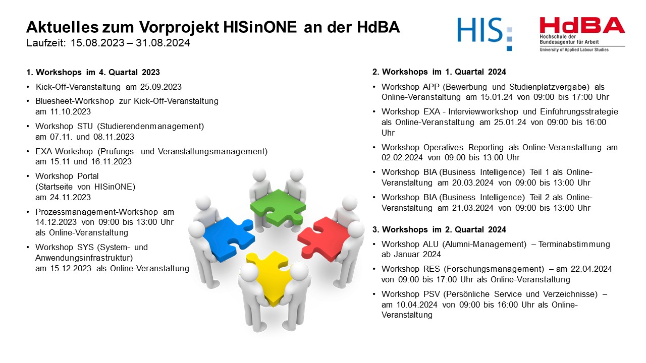 Am 15. August 2023 ist das Vorbereitungsprojekt gestartet, mit einer Laufzeit bis zum 31. August 2024. In diesem Jahr lernt die HIS eG uns, unsere Hochschule und unseren Prozesse genauer kennen. Mit campusübergreifenden Arbeitsgruppen, die aus Expertinnen und Experten aus allen Bereichen der Hochschulverwaltung sowie den Bereichen Rektorat, Wissenschaftliche Weiterbildung und Forschung gebildet wurden, nehmen wir in gemeinsamen Workshops unsere heute gelebten und im atuellen HIS-System abgebildeten Prozesse und Abläufe unter die Lupe und lernen über die Fachberater der HIS eG die neuen Module von HISinOne kennen.